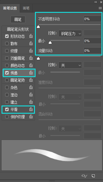 选择,点开钢笔压力,最小0%,流量抖动0%,同时点开平滑就可以了。