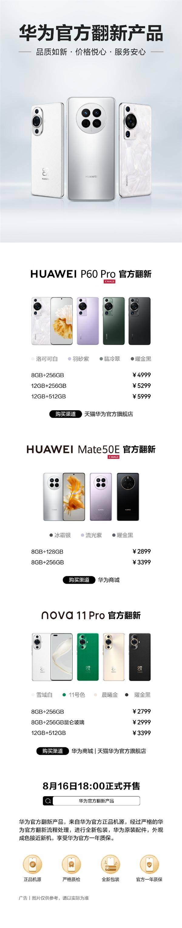 8月18日消息,日前,华为Mate 50E、nova 11 Pro、华为P60 Pro官方翻新版正式开售。