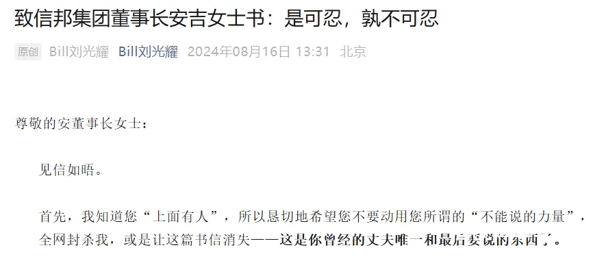 8月16日,刘光耀在个人微信公众号发布致信邦集团董事长安吉女士书:是可忍,孰不可忍公开信,信中指安吉存多次在国外代孕,并对安吉威胁撤资、公开相关借款协议等事提出质疑。