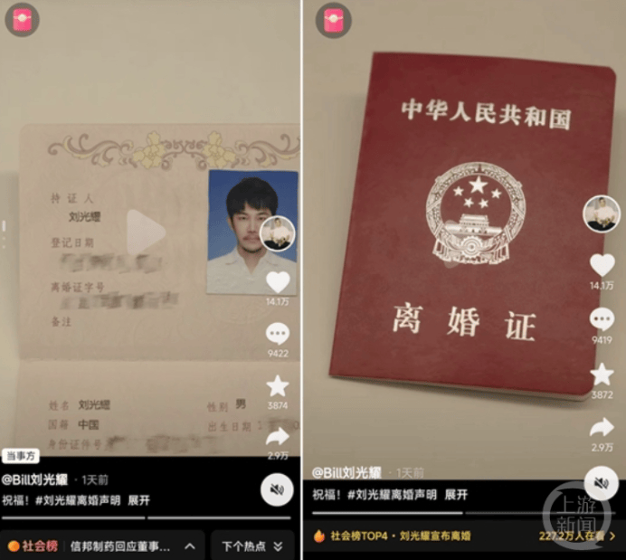 刘光耀在抖音发布离婚证的视频冲上热搜。图/上游新闻
