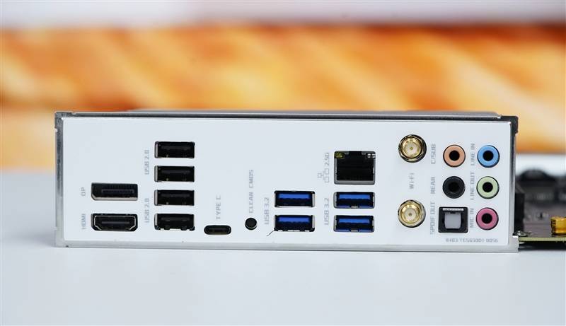 全白挡板,背部I/O接口分别是: 1xClear CMOS、1xDP、1xHDMI、4xUSB 2.0、4xUSB 3.2 Gen 1、1xUSB3.2 Gen2 Type-C 10Gbps、1x2.5Gbps网口、2xWi-Fi天线口、5*3.5mm音频,还有一个光纤音频接口。