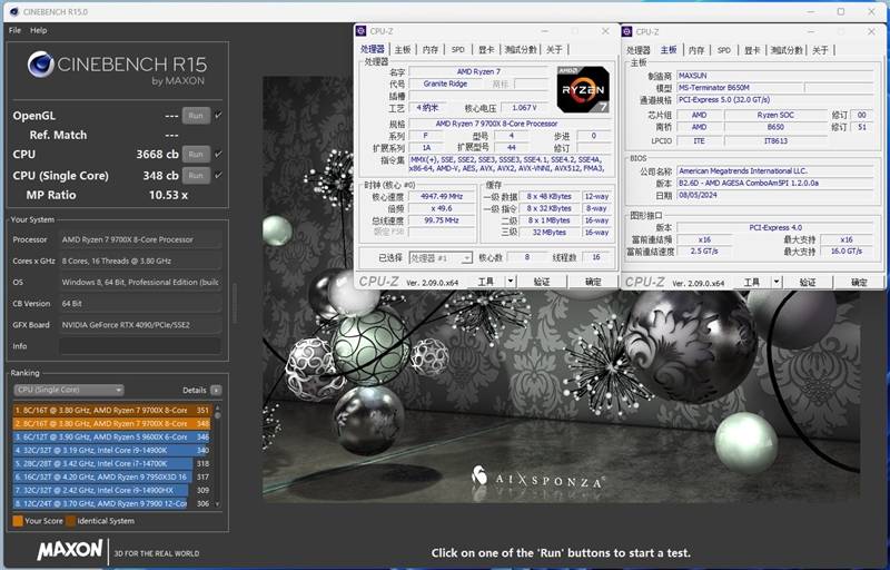 实测锐龙7 9700X单线程分数为348cb,多线程成绩则为3668cb。