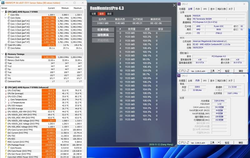 P.s.很多主板可以在UCLK=MCLK时达成6400MHz内存频率,并且能运行一些测试程序,但是在MemtestPro稳定性测试中会出现报错的情况。