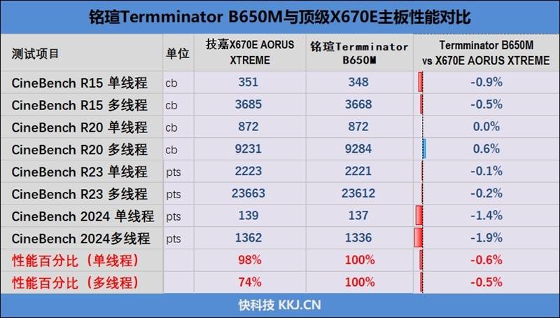 搭配锐龙7 9700X处理器,铭瑄终结者 B650M的性能表现与技嘉X670E AORUS XTREME没有太大差异,单核仅落后了0.6%,多核性能也只有0.5%的差距。