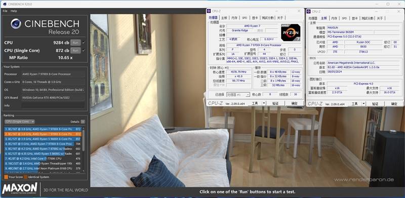 在CineBench R20测试中,锐龙7 9700X的单线程成绩是872cb,多线程成绩为9281cb。