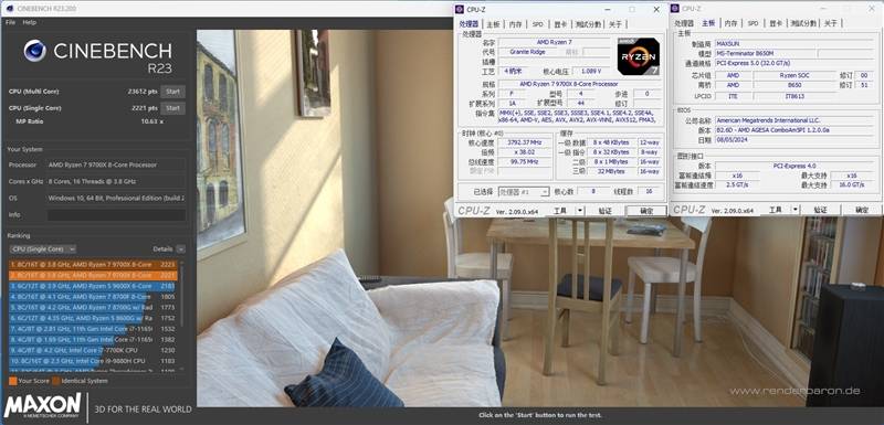 在CineBench R23测试中,锐龙7 9700X单线程成绩为2221pts,多线程分数为23612pts。