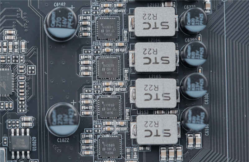 供电电路特写,DrMOS型号是SIC639,这是一颗 SPS MOS,单颗最高支持 50A 的供电电流,。
