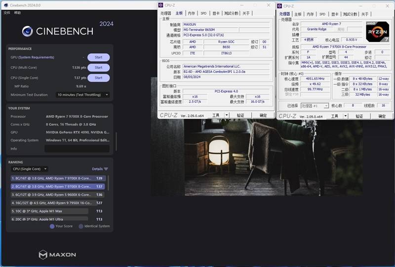 在CineBench 2024测试中,锐龙7 9700X单线程成绩为137pts,多线程分数为1336pts。