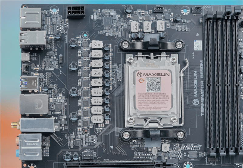 铭瑄 MS-终结者 B650M主板采用8+2+1相供电电路设计,核心与核显每相配备一个50A的DrMOS,理论上可以支持500W以上的功率输出,搭载锐龙9 9950X也没有什么难度。