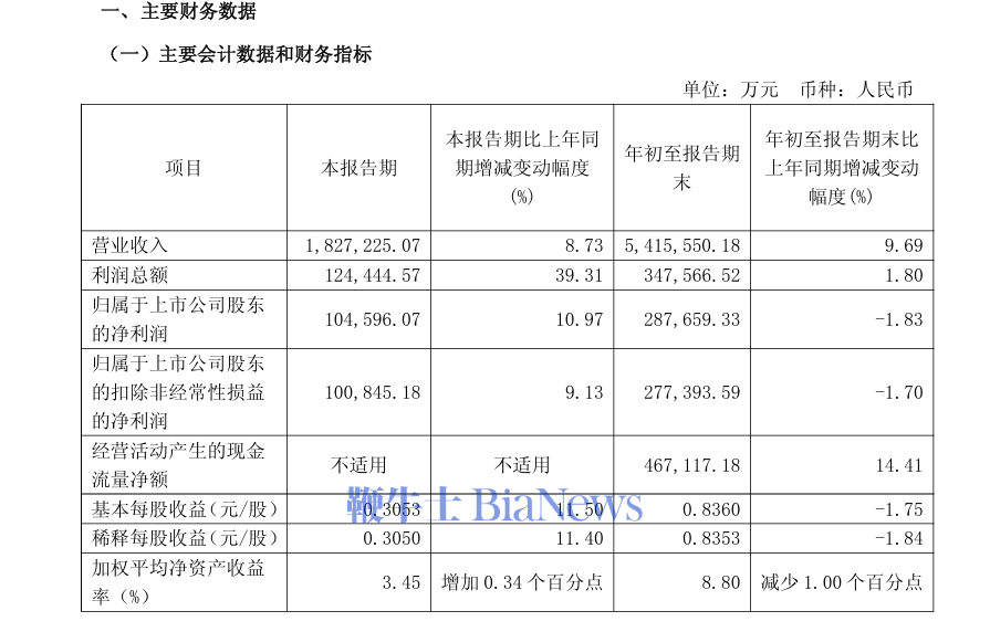 基本每股收益0.3053元/股,同比增长11.50%;稀释每股收益0.3050元/股,同比增长11.40%;加权平均净资产收益率3.45%,较上年同期增加0.34个百分点。