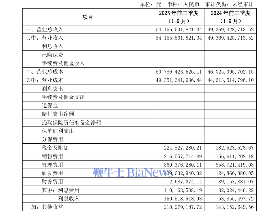 2025年1-9月,营业收入541.56亿元,同比增长9.69%;利润总额34.76亿元,同比增长1.80%;归属于上市公司股东的净利润28.77亿元,同比下降1.83%;