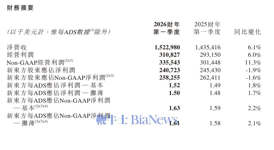 2026财年第一季度,新东方净营收为1522980千美元,较2025财年第一季度的1435416千美元同比上升6.1%;