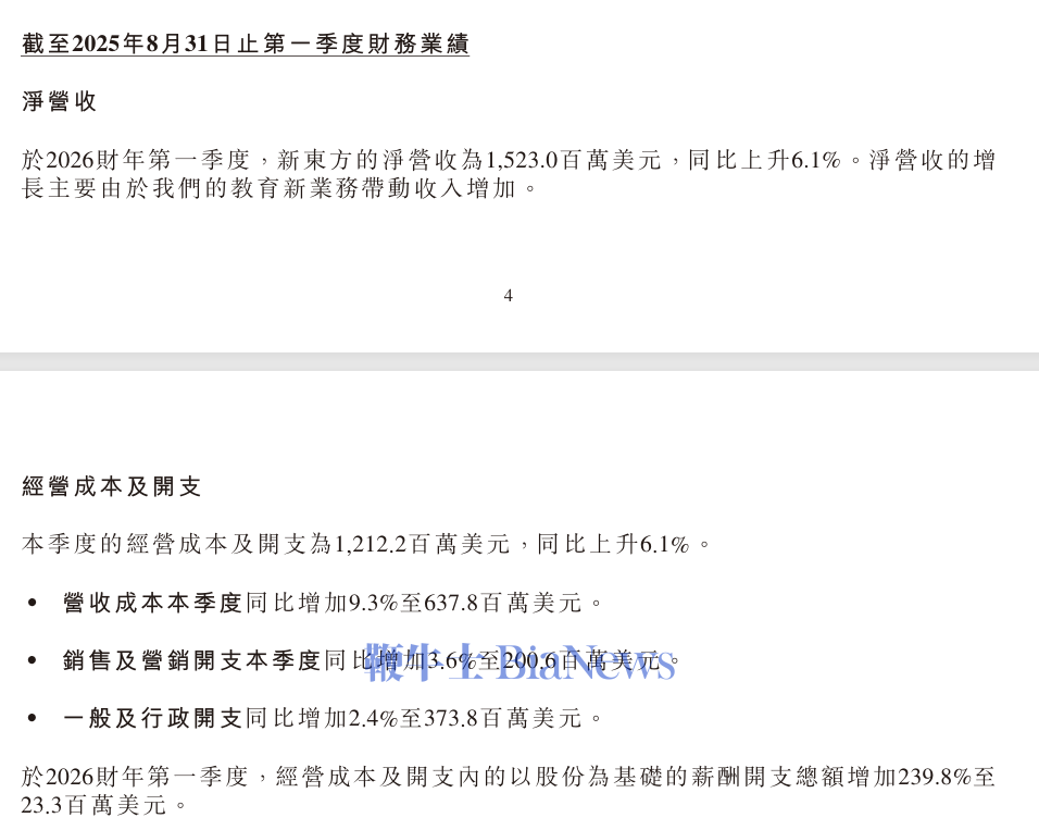 2026财年第一季度,新东方经营成本及开支总额为1212153千美元,较2025财年第一季度的1142266千美元同比上升6.1%。
