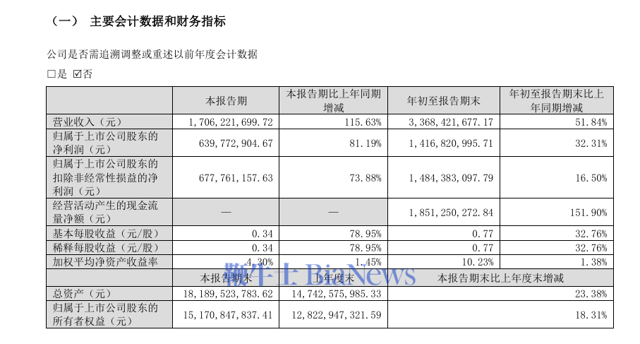 前三季度营收为33.68亿元,同比增长51.84%;净利润为14.17亿元,同比增长32.31%。