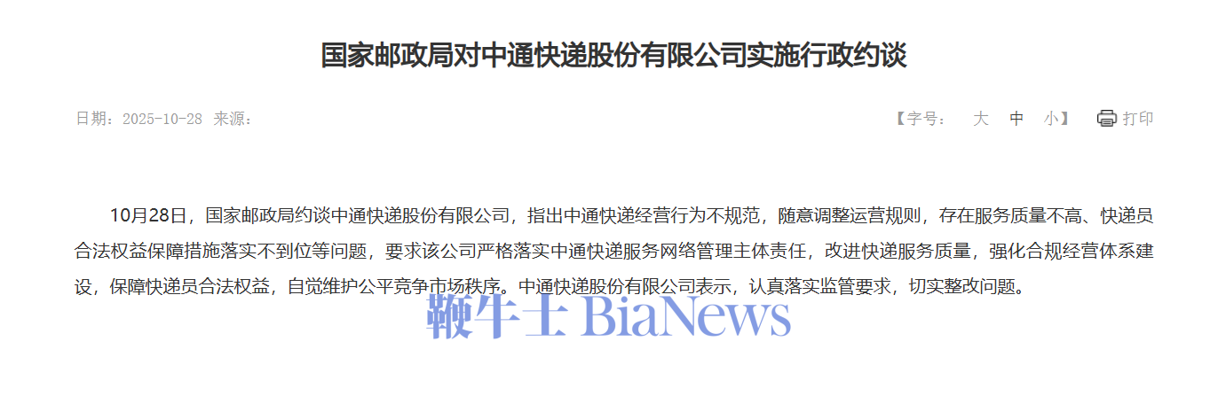 10月28日,国家邮政局约谈中通快递股份有限公司,指出中通快递经营行为不规范,随意调整运营规则,存在服务质量不高、快递员合法权益保障措施落实不到位等问题,要求该公司严格落实中通快递服务网络管理主体责任,改进快递服务质量,强化合规经营体系建设,保障快递员合法权益,自觉维护公平竞争市场秩序。
