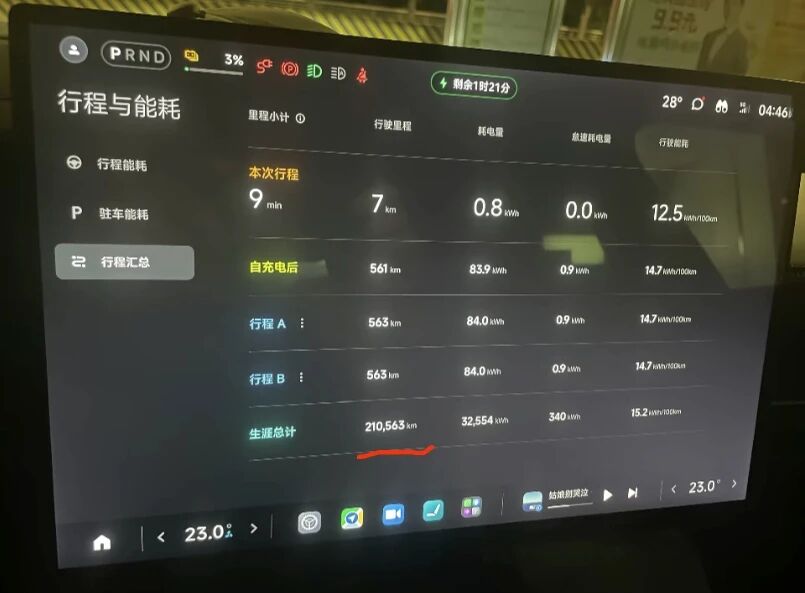 该车主提车一年多,车辆行驶里程已突破21万公里(目前已超22万公里)。然而车辆核心性能表现依然亮眼,电池衰减仅约5%,满电续航仍能超过560公里。