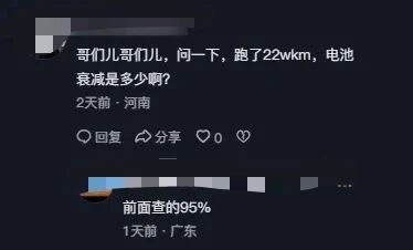 有网友询问车主跑了22万公里后电池衰减多少;该车主回应称还剩95%。