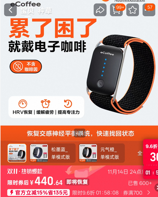 详细来看,手环背面有两片电极片,使用时电极片会发出温和的电脉冲,精准作用于手腕内侧的正中神经,就能模拟出喝咖啡的提神效果。