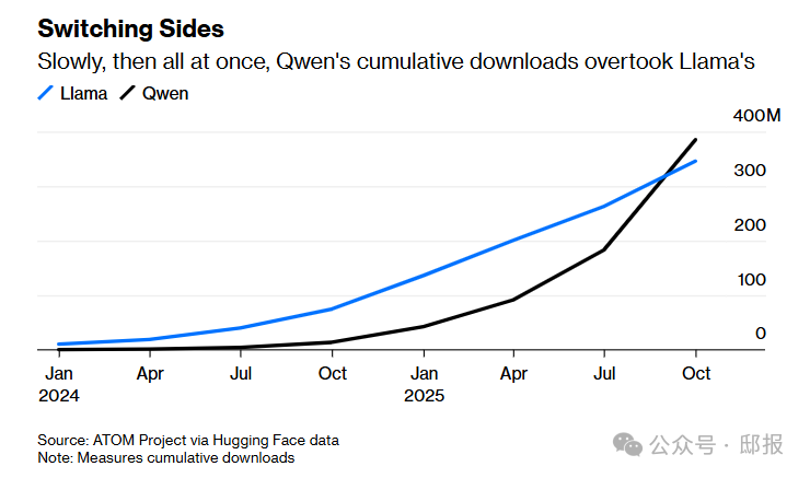 Qwen的累计下载量先是缓慢地,然后突然之间超过了Llama的。