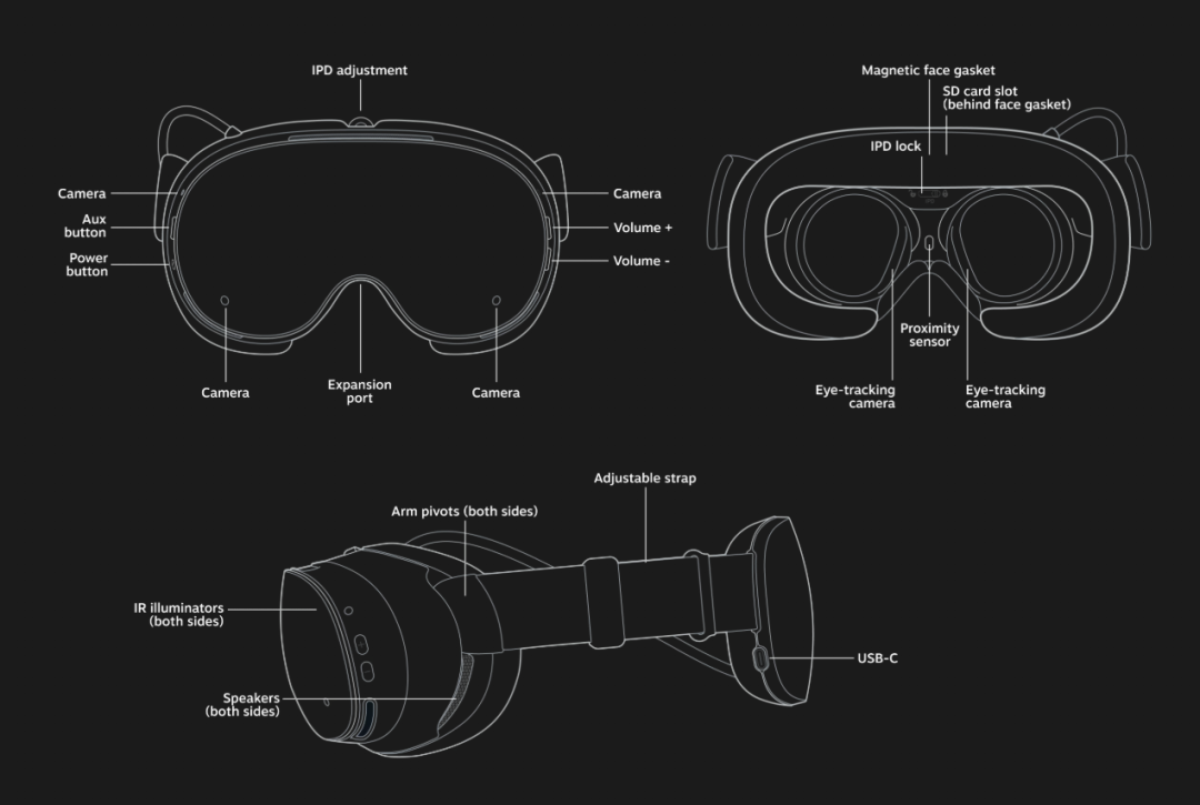 光学特性方面,头显采用定制 pancake 透镜方案,包括 2160 x 2160 LCD 面板,每眼各一,支持 72 - 144Hz 刷新率
