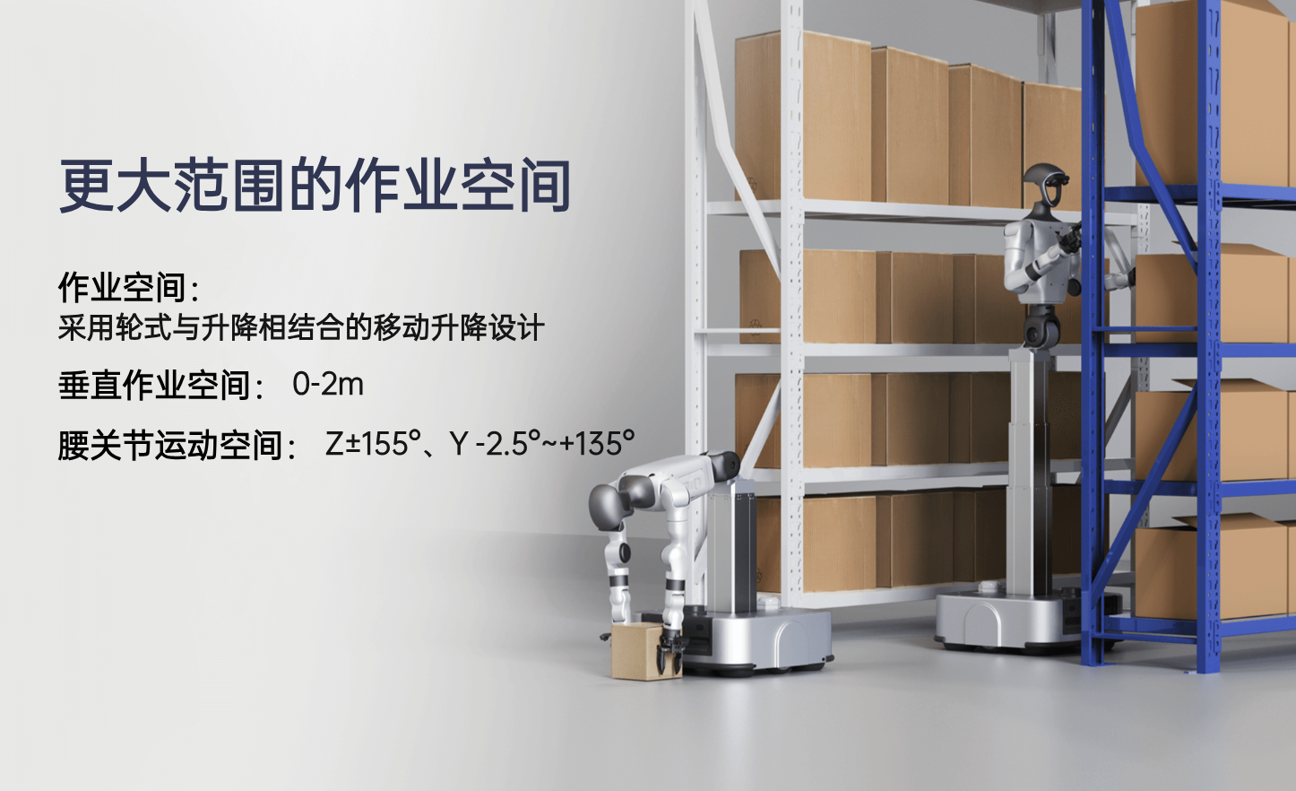 G1-D采用轮式与升降相结合的移动升降设计,垂直作业空间为0-2m,腰关节运动空间为Z±155°、Y -2.5°~+135°。