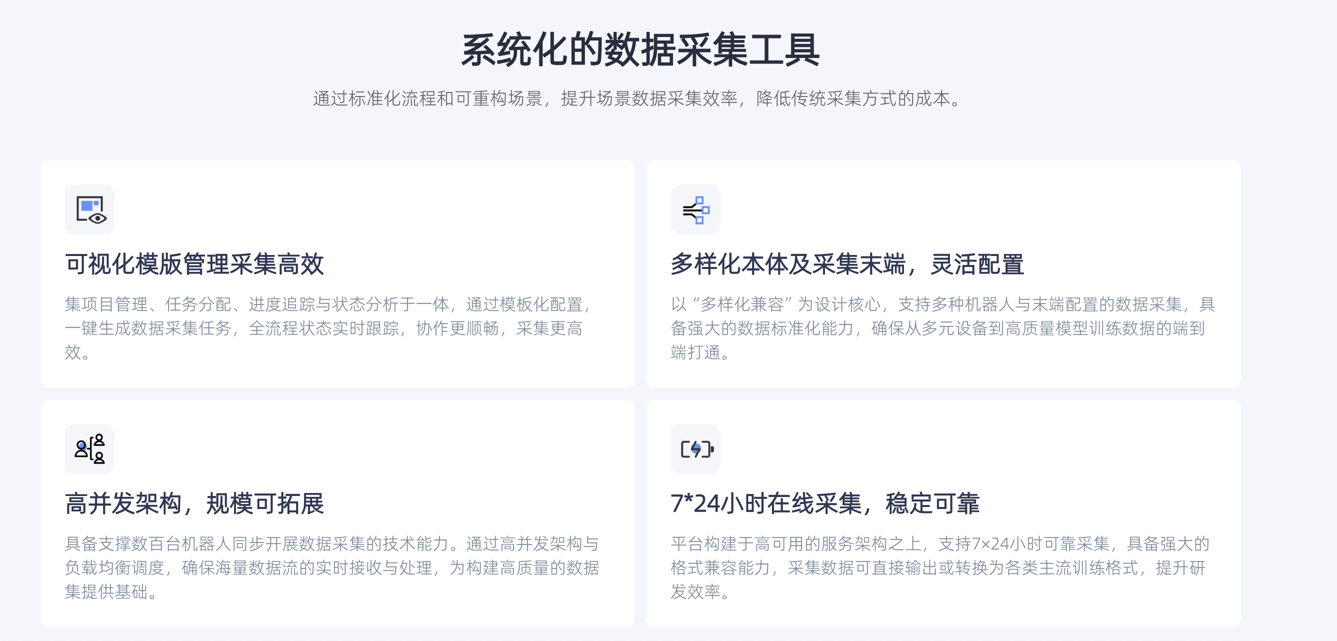 此外,G1-D搭载的数采平台,支持多种机器人与末端配置的数据采集,具备支撑数百台机器人同步开展数据采集的技术能力,支持7×24小时可靠采集,采集数据可直接输出或转换为各类主流训练格式。