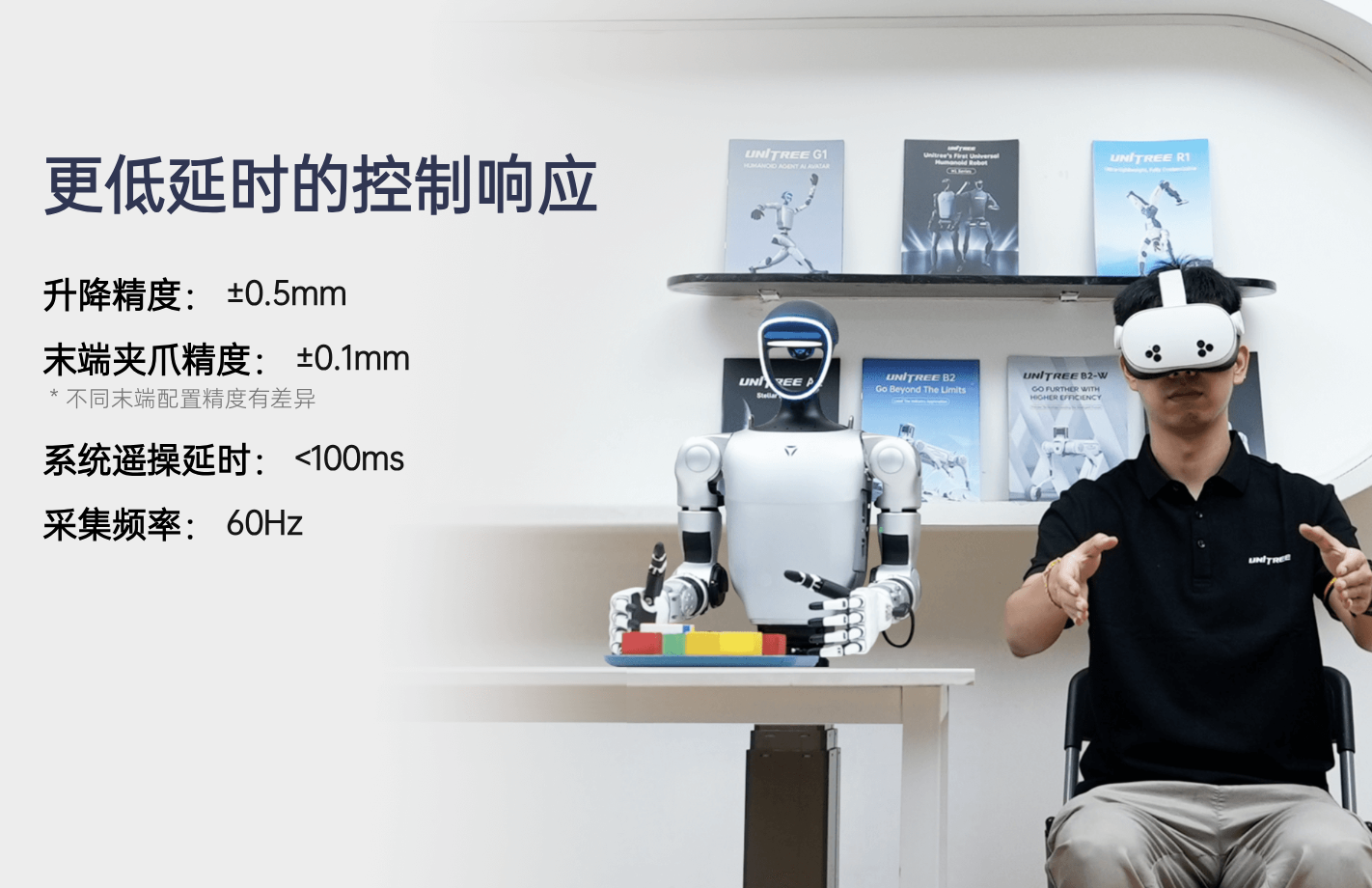 G1-D的升降精度±0.5mm,末端夹爪精度±0.1mm,系统遥操延时<100ms。