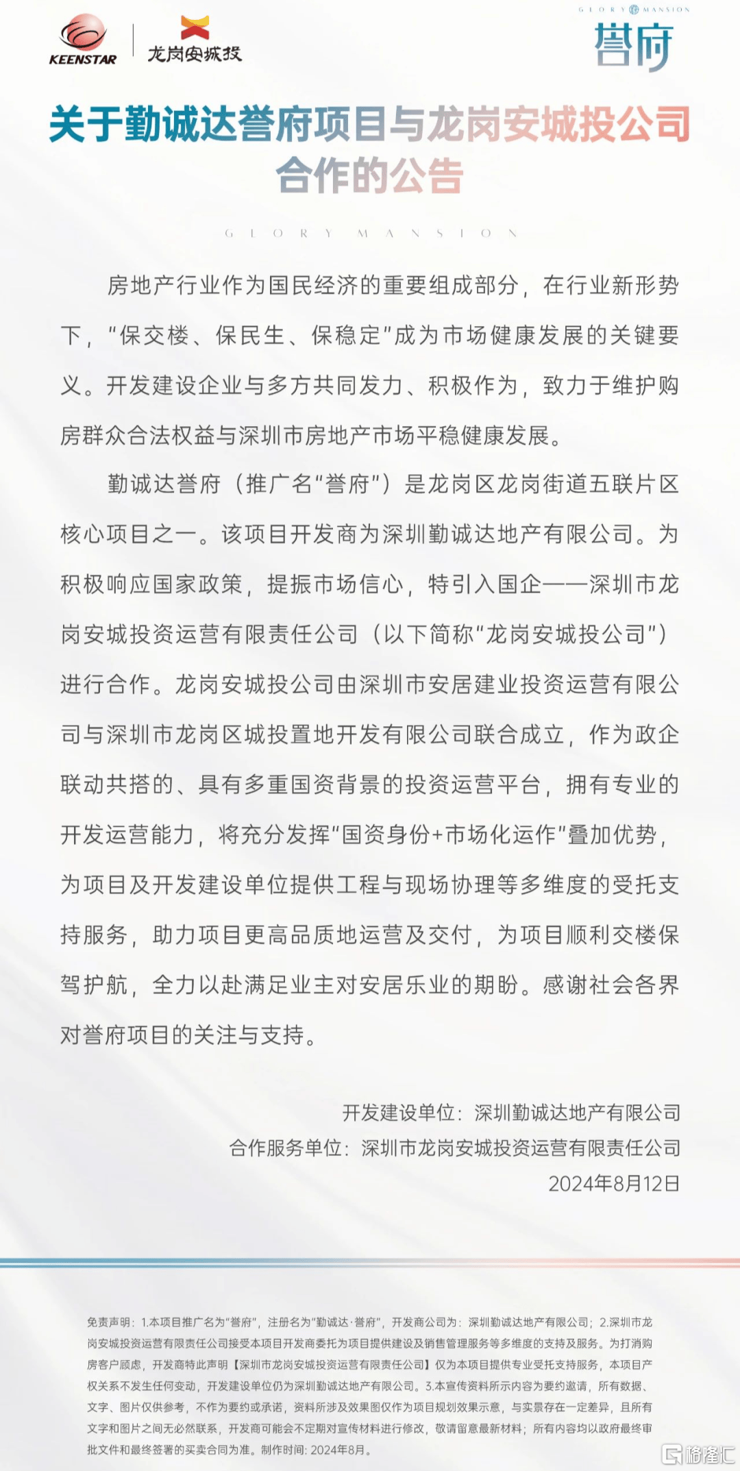 公告显示引入由深圳市安居建业投资运营有限公司与深圳市龙岗区城投置地开发有限公司联合成立的龙岗安城投公司合作,以确保项目能够顺利交楼。