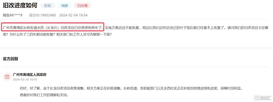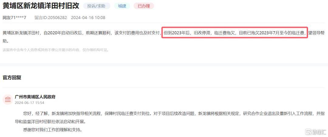 根据领导留言板显示,2022年6月勤诚达正式签约广州黄埔区的长龙片旧村改造已经陷入停滞状态两年之久,就连广州的洋田村的旧改项目拆迁后迟迟没有动工,临迁费拖欠超过1年。