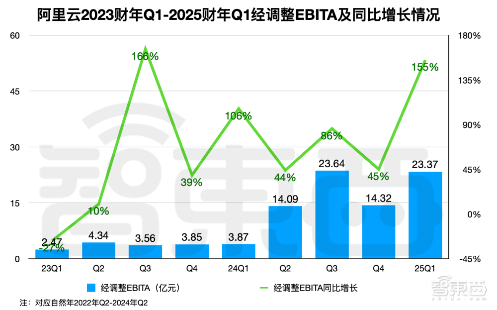 而阿里云是率先在风口上飞起来的玩家。如下图所示,将时间线拉长到八个财年的维度,可以更明显地看到AI及公有云对阿里云业务拉动力之强劲。刚刚过去的2024财年(对应自然年2023年Q2-2024年Q1),覆盖了“百模大战”从打响到高潮,阿里云营收增长回暖,经调整EBITA利润超过2023财年的3倍。2025财年Q1(对于自然年2024年Q2)则延续了前一年的业绩回暖趋势。