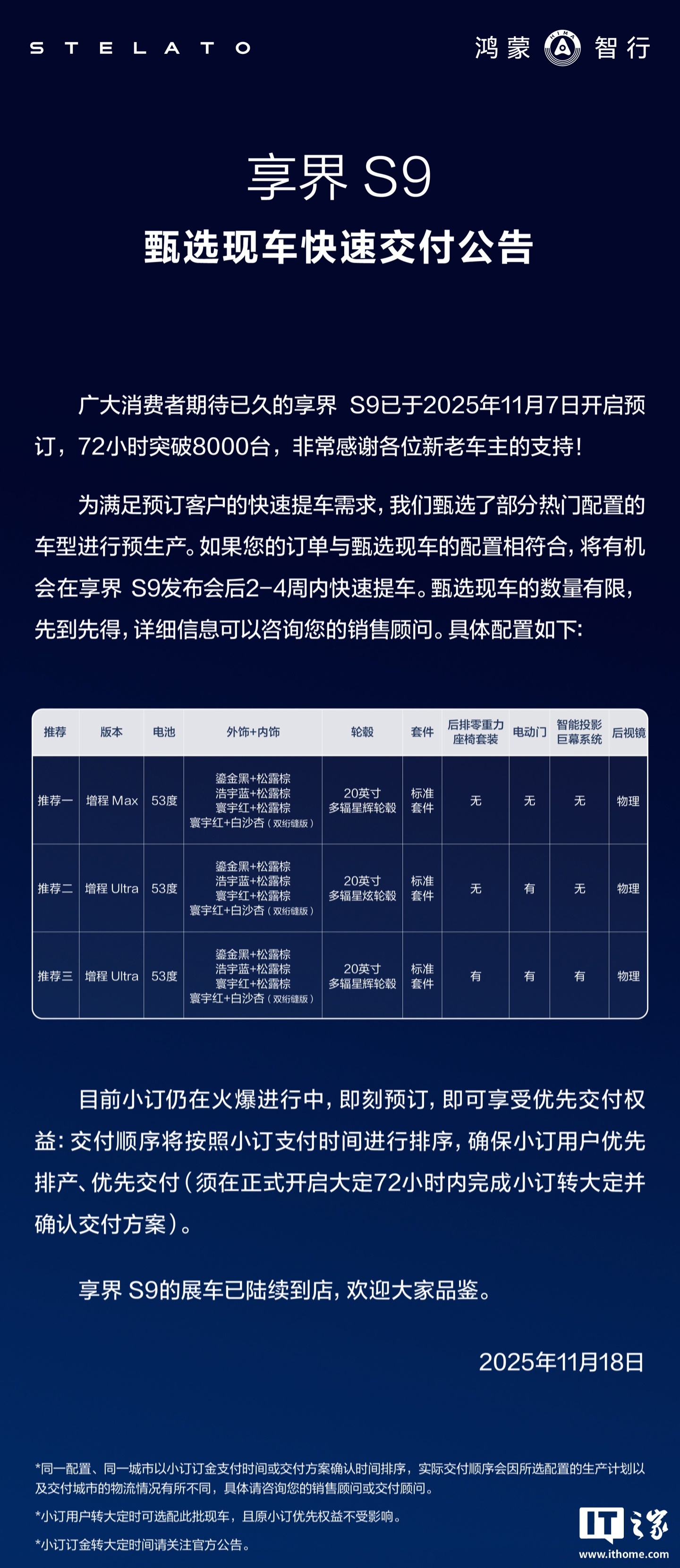IT之家 11 月 18 日消息,鸿蒙智行官方今日发布了“享界 S9 甄选现车快速交付公告”,宣布甄选了部分热门配置进行预生产,用户所选车辆如果与甄选现车配置相符合,有机会在发布会后 2-4 周快速提车。
