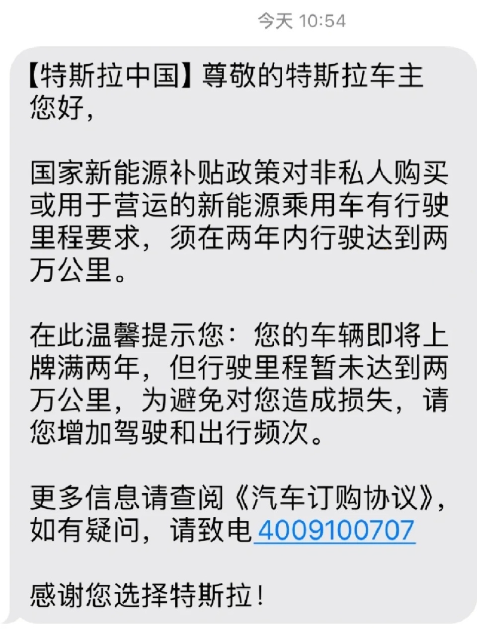 另有企业员工称,其曾收到特斯拉短信提示称:“您的车辆即将上牌满两年,但行驶里程暂未达到两万公里,为避免对您造成损失,请您增加驾驶和出行频次。”