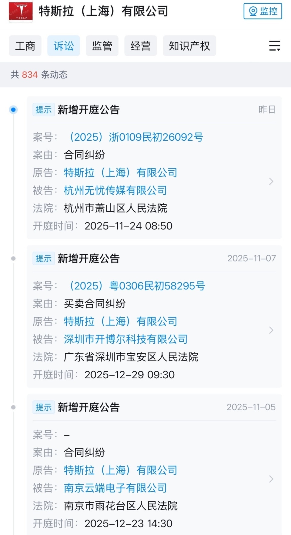 天眼查信息显示,2025年7月至今,特斯拉(上海)有限公司近日新增30余件涉及合同纠纷、买卖合同纠纷的开庭公告,原告为特斯拉,被告方涉及广东、浙江、江苏、山东、湖南等地的建筑、制造等各领域企业。