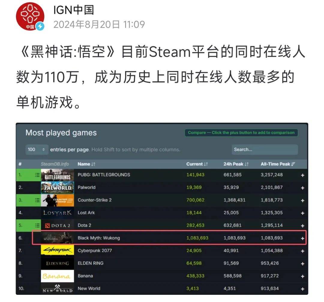 根据全球游戏评分网站metacritic统计,截至8月19日,54家全球媒体给出了平均82分的评价,其中GamingBolt、God is a Geek、GamersRD更是直接打了满分。这种好评度也反映在了销量上,Valve公布的Steam平台最新一周销量榜,《黑神话:悟空》位列Steam全球周销量冠军,在美国、新加坡、泰国、加拿大、巴西、意大利等地区霸榜。游戏上线之后,《黑神话:悟空》Steam的同时在线人数还引发了海外网友热议,称“太神奇了,简直不敢相信这些数字”。