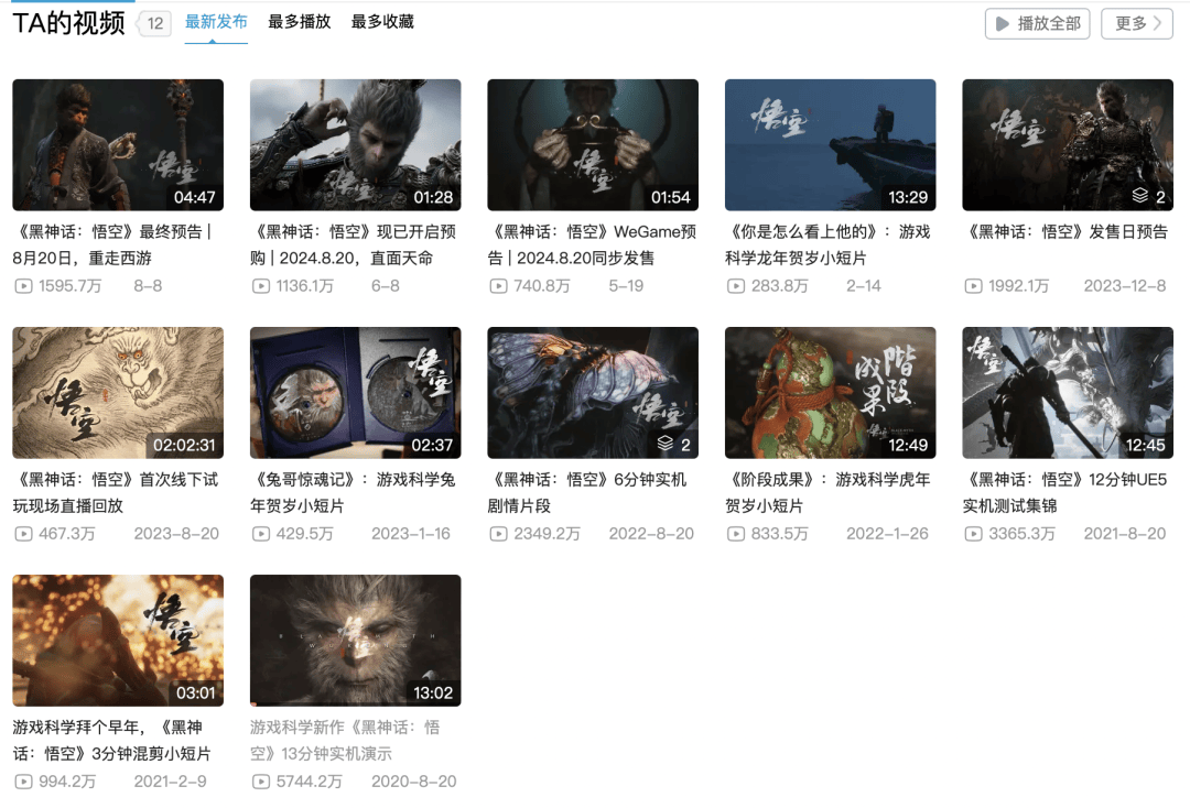 其实在2020年,《黑神话:悟空》发布的第一支视频就是从B站率先爆发,2小时冲至B站热门第一,24小时播放量破千万,之后蔓延到其他平台,成为全网热门。在此后的宣传思路上,B站便成了《黑神话:悟空》的重点平台,无论是每年的视频预告、还是线下试玩的独家直播,背后都绕不开B站。