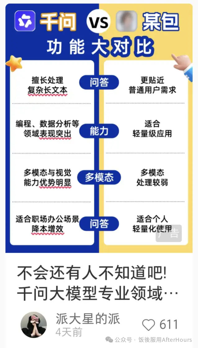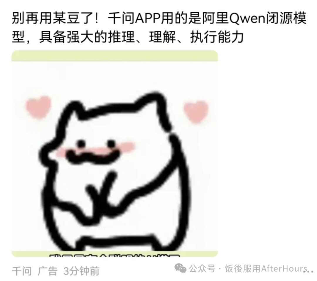 大概意思是阿里千问的pr,在给某些渠道brief 的时候,方向明确指出拉踩豆包和deepseek这两个直接竞品,说豆包笨,deepseek过时,就被淘汰了不是我请问呢,我用豆包和deepseek怎么就被淘汰了,这两家产品月活加起来有两个亿吧,你千问大模型一出来直接把2亿中国人淘汰了?没明白什么意思,我又一次当人才被输送到社会了用个AI模型还搞出苹果安卓人这一套了以后用千问的就是苹果人呗,用豆包和deepseek的就是安卓人呗。以后也不用说什么苹果安卓人了,想显得自己高贵就说自己是千问人