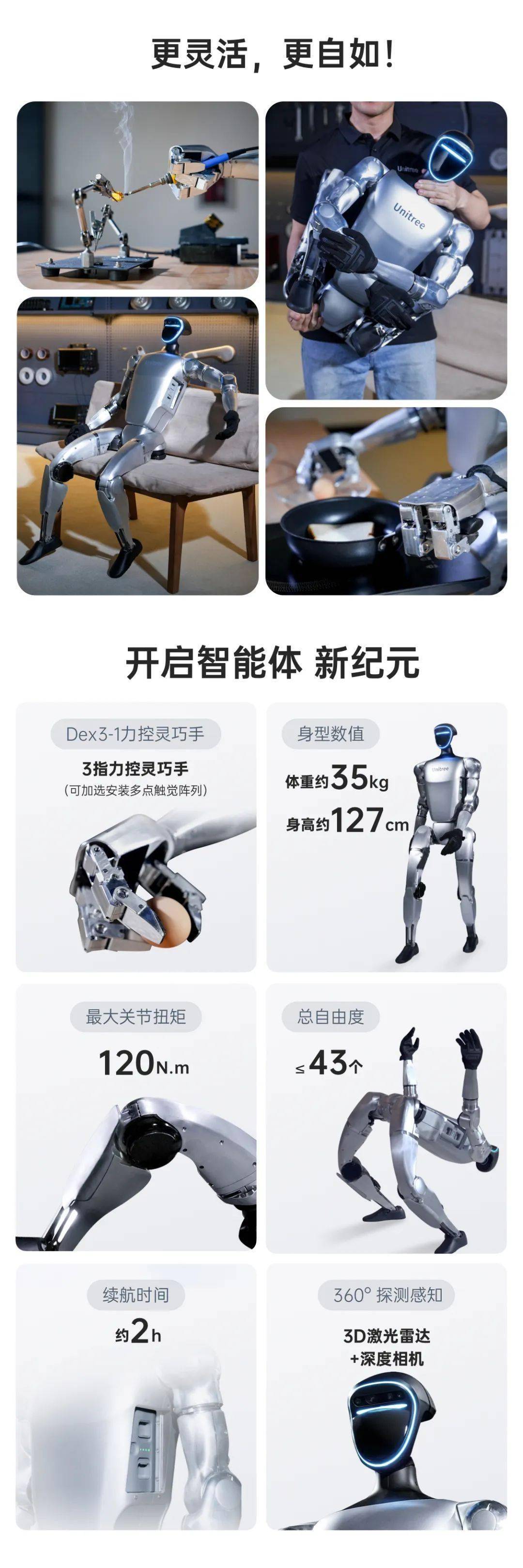 根据官方介绍,该机器人体重约 35kg、身高约 127cm,拥有 23~43 个关节电机,关节最大扭矩 120N・m;支持模仿 & 强化学习驱动,“在 AI 加速下的机器人技术,每天都在升级进化”。