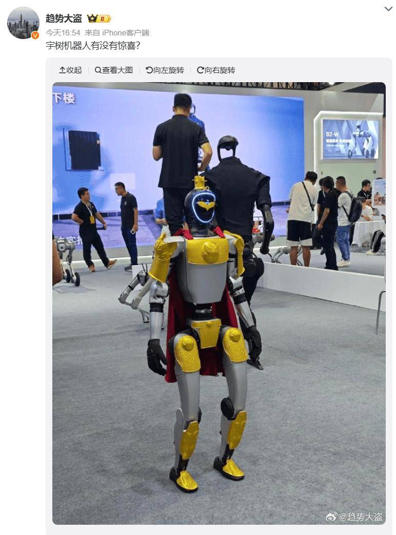 此外,宇树官方放了一个小彩蛋,推出 G1 机器人的“悟空”造型版本。注意到,该定制设计已于今日在 2024 世界机器人大会上亮相。