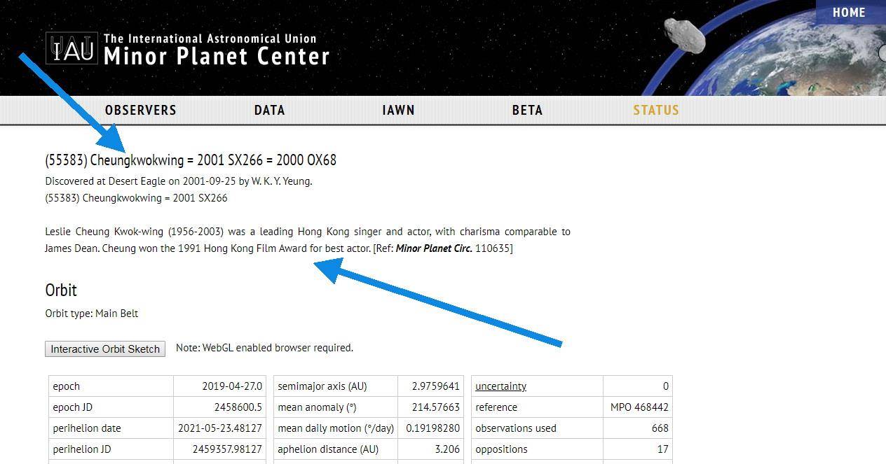 国际天文学联合会发布的《小行星通告》上还显示,和张国荣一起提交的梅艳芳,命名也获得批准通过。