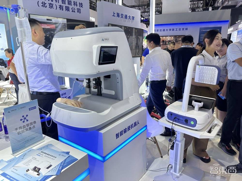 抽血、输液机器人也可以完成了!伏羲九针的智能静脉辅助穿刺系统可以让机器人直接帮你抽血,还有智能输液机器人,只需要把胳膊放进去就可以完成输液,不过现场未看到演示。