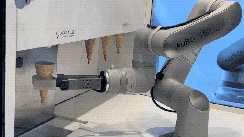 喝完咖啡再来一口甜甜的冰激淋,遨博智能的冰激淋机器人十分实在,每个冰激淋都堆的十分高。
