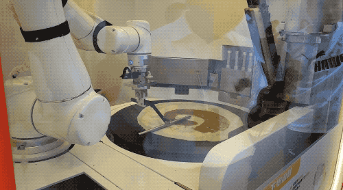 修身养性结束,走在展区突然一阵香味扑鼻,我看到了在大会现场正式上岗的久秉AI餐饮机器人,它能自主完成煎饼果子的制作,不仅能根据顾客的需求选择是否添加香菜、葱花等,还能自动折饼、包装。