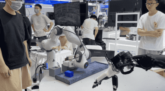 同时,这一机器人还能实现语音交互抓取,例如工作人员要求它“将苹果放到绿色的碗”里。
