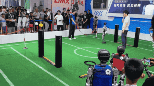 他们在展区里直接搞了一场机器人大赛,两台机器人分属雷神队、火神队,谁率先通过障碍冲过终点就获胜,不少小朋友在场外自发组成拉拉队为机器人呐喊助威。