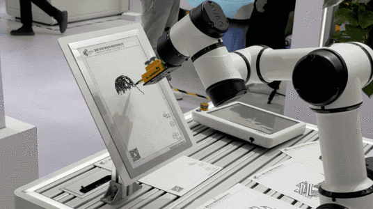 遨博智能和北京大学的绘画机器人都在展会上画起了肖像画。不过,如果单看前面的绘画过程,机器人的每一笔都落在了我意想不到的位置,很难直接看出它们到底画了什么。