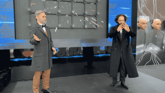 左边是诺贝尔机器人小剧场,扮演“炸药之王”和“和平之父”两个角色的机器人在声情并茂激辩,不仅外形相似,EX机器⼈还通过声纹模拟了诺贝尔的音色。