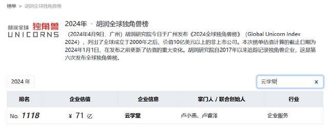 今年4月,云学堂以71亿的估值位列《2024年胡润全球独角兽榜》第1118名,这也是它连续第四年获此殊荣。