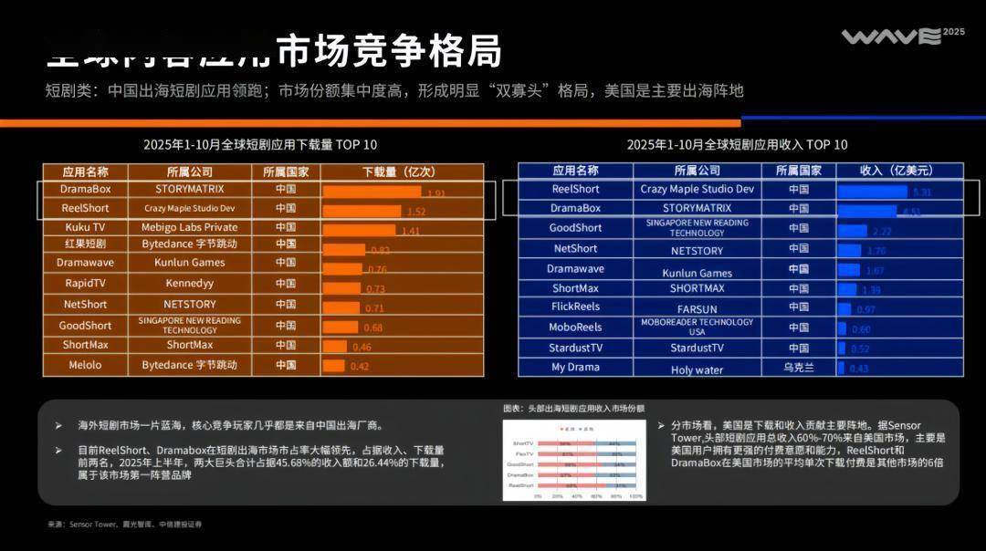 正如杰夫所说,霞光智库发布的《2025中国泛互联网出海洞察》报告显示,2025年一月至十月全球应用下载量和收入TOP10的短剧公司,全部来自中国。
