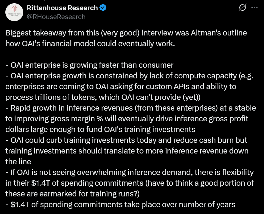 有人评论说,这次采访给人的最大收获,就是奥特曼终于讲清了OpenAI的财务模式到底是怎么运作的。