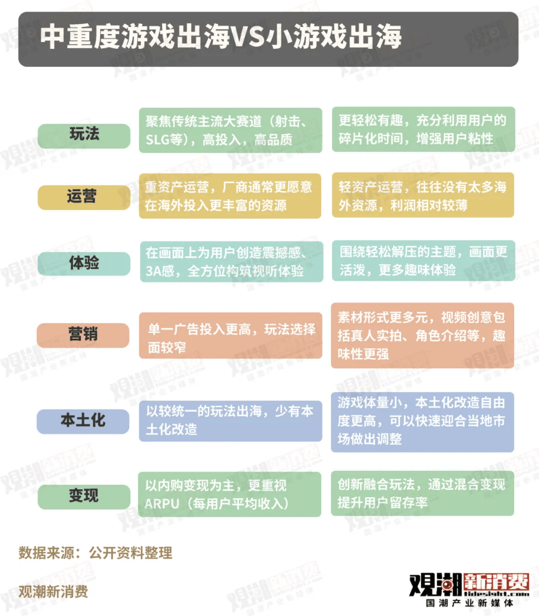 在游戏出海上,高投入的中重度游戏市场已经较为固定,大部分市场份额已被几个大厂——莉莉丝、米哈游、腾讯等瓜分,对于中小厂商来说,投入相对较少的小游戏则成为更好的出海选择。